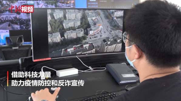 据了解,该无人机是金山公安分局专门调取的警用无人机,借助科技力量助力疫情防控和反诈宣传。(李秋莹 制作 周璟)