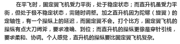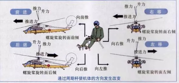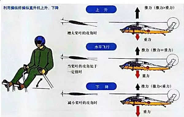 油门,就是单纯的油门,直接控制发动机的功率,决定动力的大小。 | 油门实际上有两个,一个显形的,一个隐形的。显形的那个,就是和固定翼飞机一样的油门杆,一般是在驾驶室顶棚的上方,只是起动的时候用,操纵的时候就不用了。隐形的那个,就是总距油门杆了。它的操纵方式是上提和下放。上提总距杆时,通过液压动作筒,带动自动倾斜器的不动环整体上升,动环跟随上升,带动变距拉杆运动,使所有桨叶的迎角同时增大,每片桨叶的升力都增加,导致整个旋翼的拉力增加。上提总距杆的同时,还有一根钢索,连接到燃油调节器,增大活门开度,提升发动机功率,用来在总桨距提升导致旋翼旋转阻力增大的同时,增加动力维持恒定的旋翼转速。下放总距杆的动作与前面相反。因为它带动的是所有桨叶的桨距,所以叫做总桨距,简称总距。 有一个概念需要明确一下,直升机旋翼的旋转速度在正常工作状态下是相对恒定的,增减功率靠的是总距的变化,不是改变转速。 |